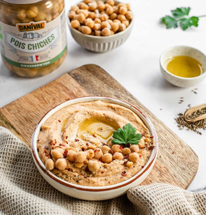 👩🍳 Notre Chef vous partage ici sa recette pour réussir votre houmous traditionnel 100% maison, avec les pois chiches cuits Danival.
